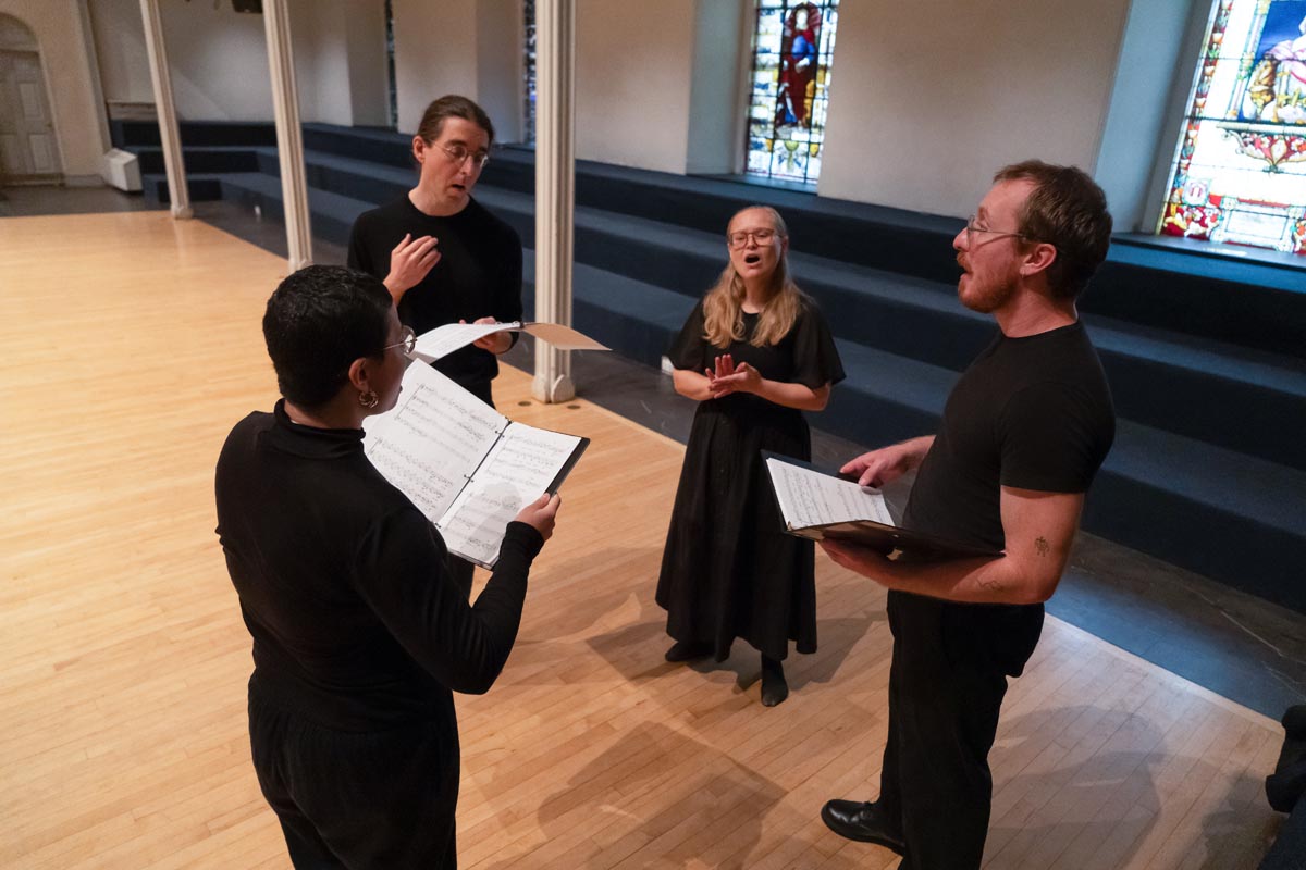 Concetta Abbate‘s Echo Glass compositions are written for vocal quartet. They are an exploration of how partially sighted individuals experience the world through hearing and vibrational touch as their primary senses. The compositional approach was inspired by Concetta’s personal experience of being born with a visual impairment, and echolocation techniques utilized by blind and partially sighted individuals to navigate space. The piece will be sung by the composer themself in collaboration with vocalists Jimmy Kraft, Judette Elliston and Damon Hankoff.